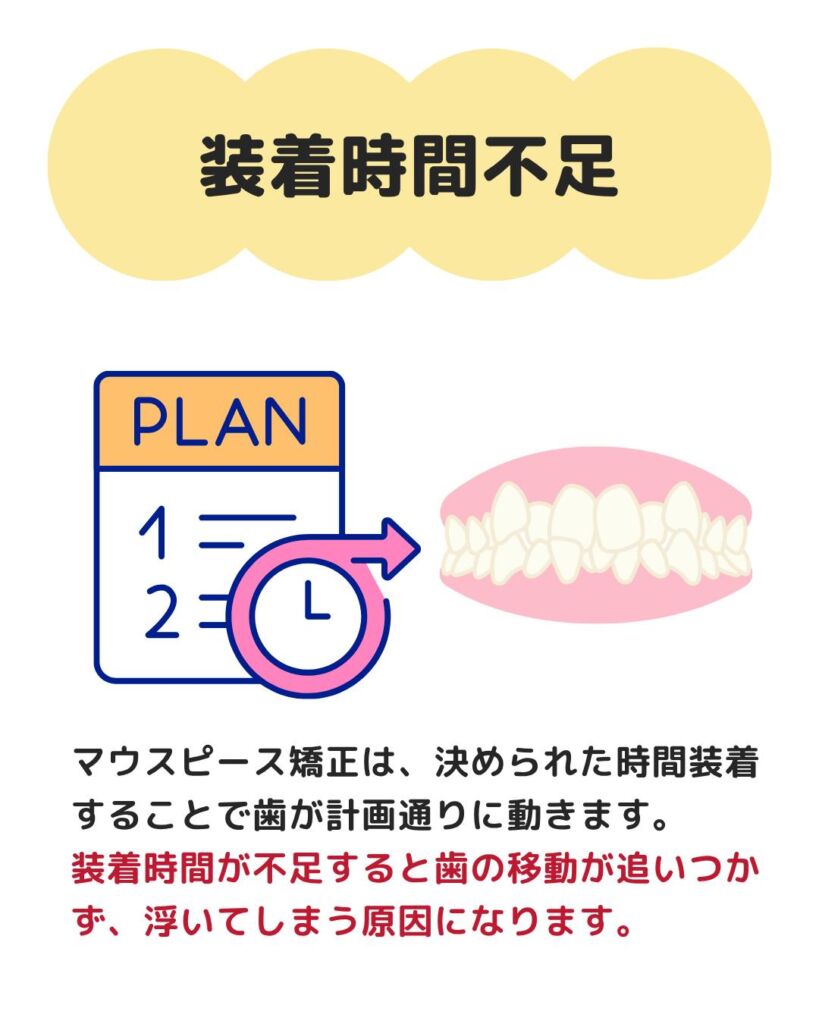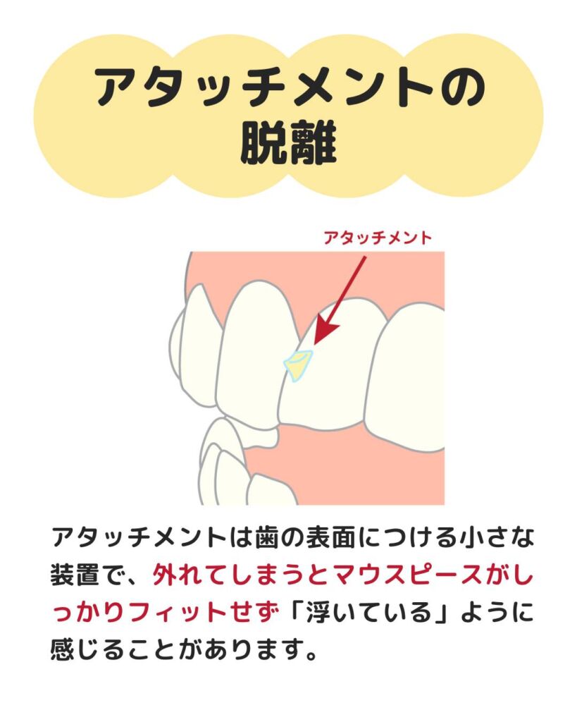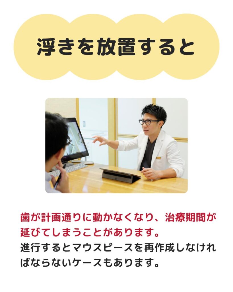浮いた状態で放置すると歯の動きが計画通り進まず、治療期間の延長やマウスピースの再作成が必要になることも⚡